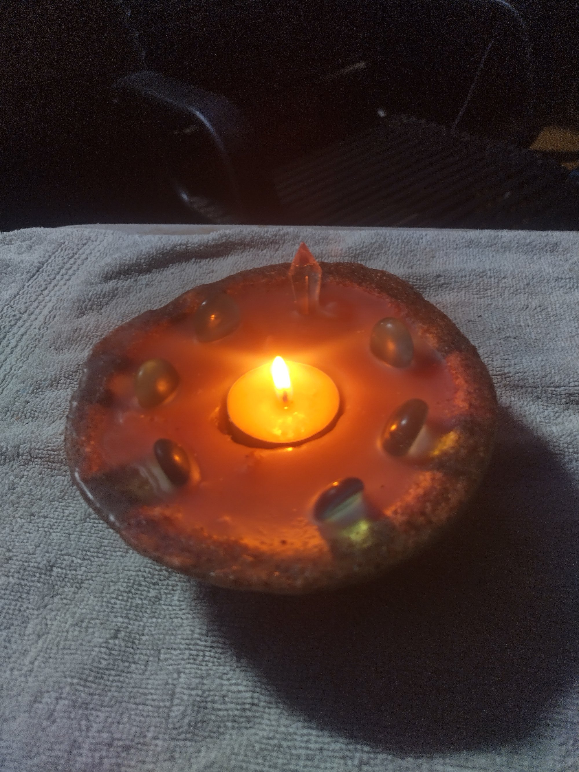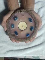 This forever vessel is poured into sand and shaped over 5–6 hours, then adorned with gems and minerals chosen for resonance. The tealight at its center is replaceable with color and scent of your choice, allowing the candle to remain a lasting companion in your rituals.